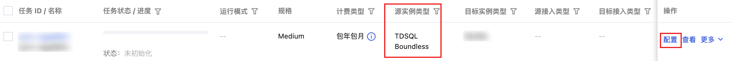 2. 购买成功后,返回数据同步列表,可看到刚创建的数据同步任务。 3. 在数据同步列表,单击操作列的配置,进入配置同步任务页面。