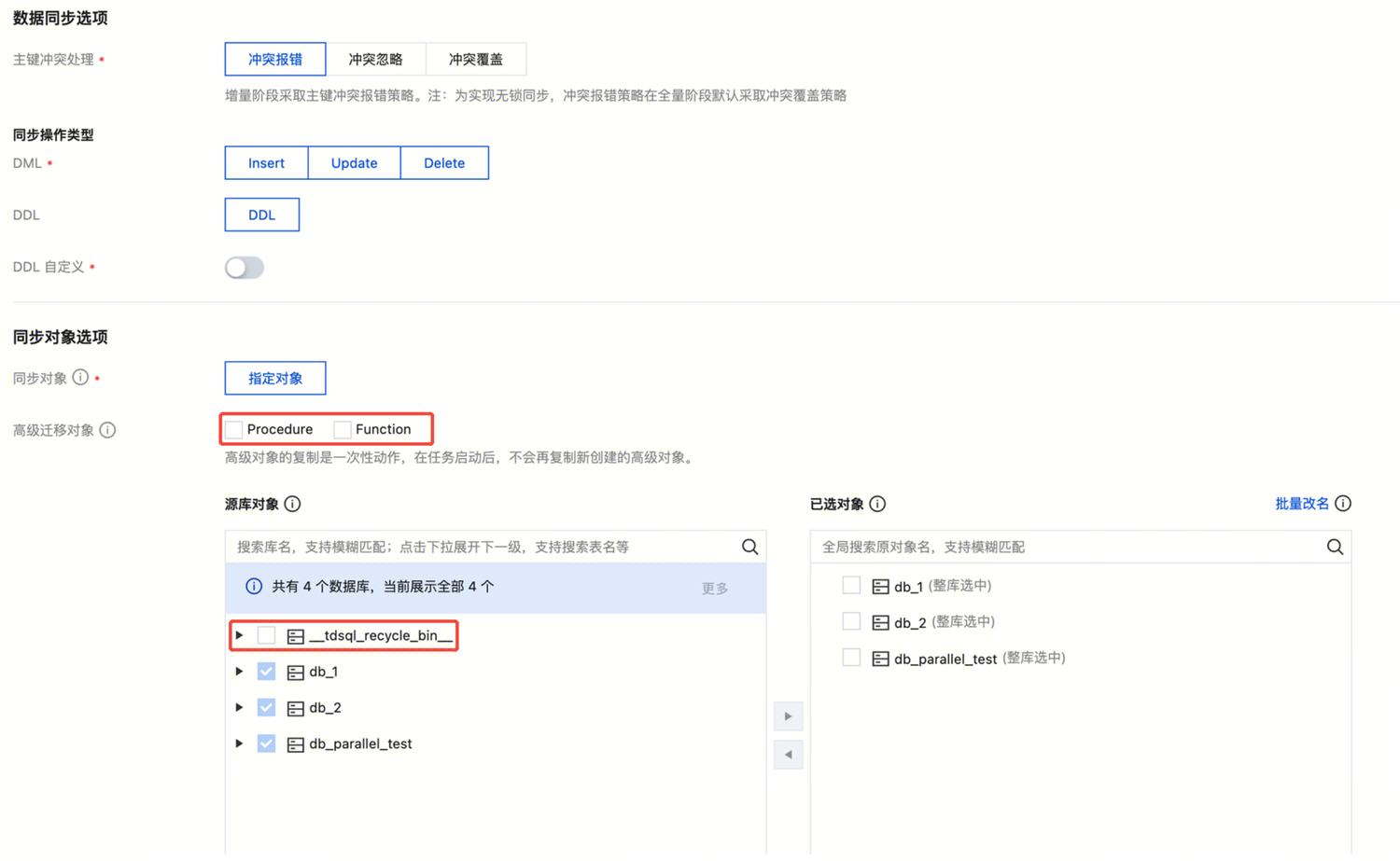 源库对象请勿勾选_tdsql_recycle_bin_,否则可能导致同步任务失败。