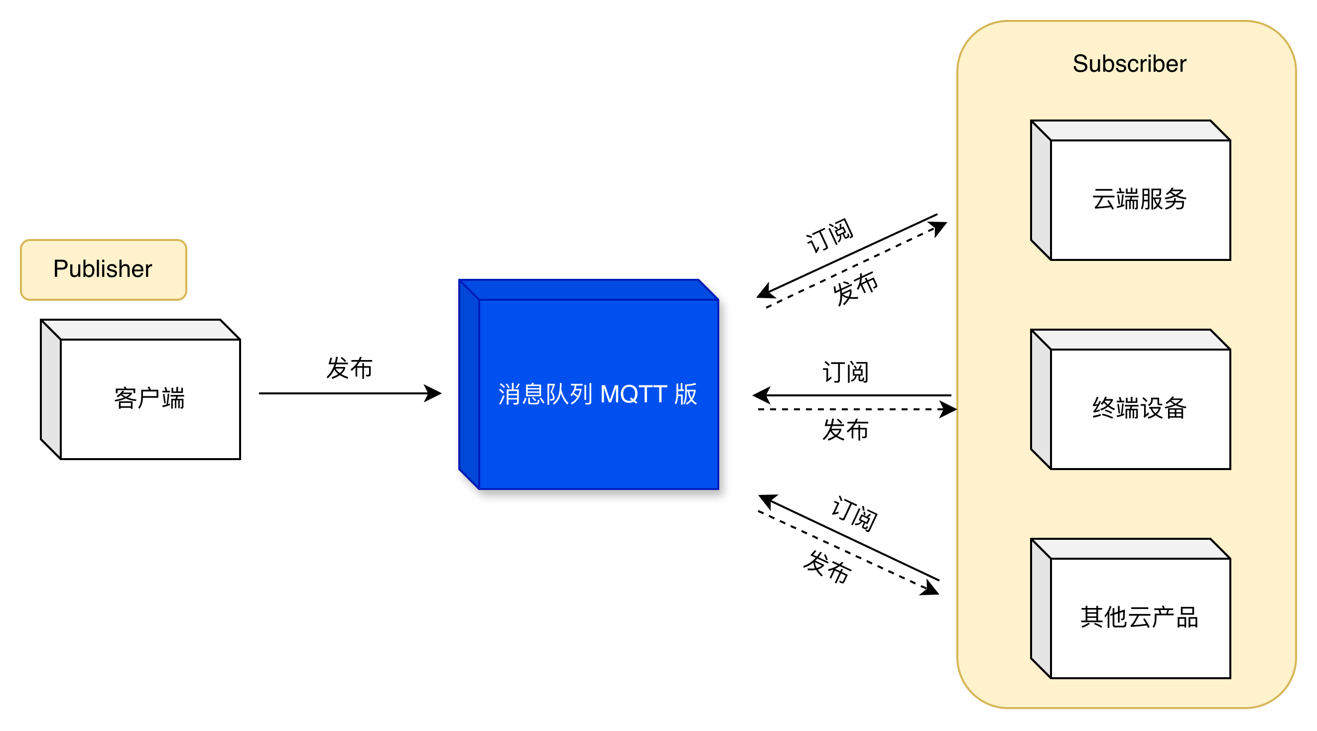 消息队列 MQTT 版(TDMQ for MQTT,简称 TDMQ MQTT 版)是一款分布式高可用的消息队列服务,通过 “发布/订阅” 模式构建了极其轻量化的消息传输协议。TDMQ MQTT 版兼容标准的 MQTT 协议,支持开源社区和业内主流 MQTT 客户端零改造接入,并在稳定性、低延迟和高性能等特性上做了加强,支持百万客户端同时在线。消息队列 MQTT 版的消息收发模型如下图所示,可实现终端与终端、终端与云端及其他云产品的交互。