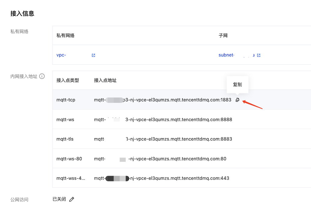 2. 在集群基本信息页面的接入信息模块,获取 VPC 接入点地址。不同接入点的差异说明请参考网络连接说明。