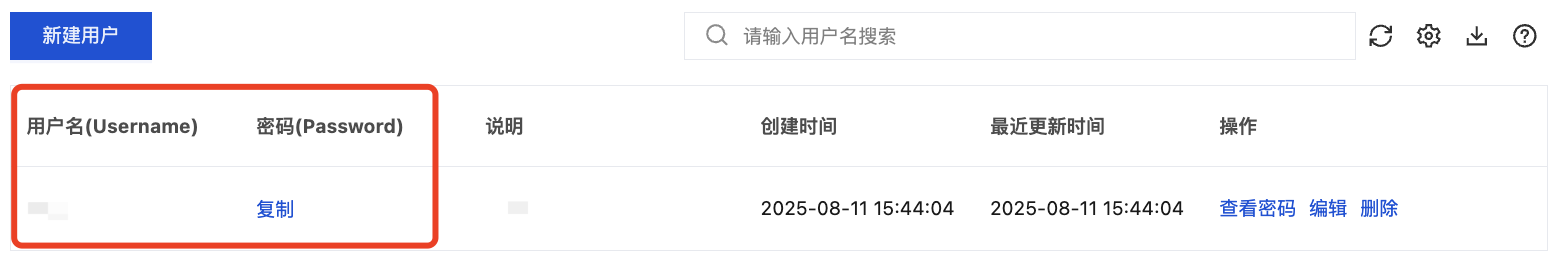 5. 单击保存,完成用户创建,后续在权限管理列表中,可以通过以下任一种方式复制用户名和密码。