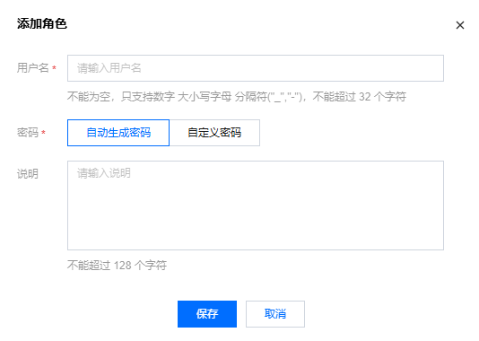 用户名:设置用户名,需符合命名规则,最长为32个字符,支持数字、大小写字母和分隔符("_","-")。