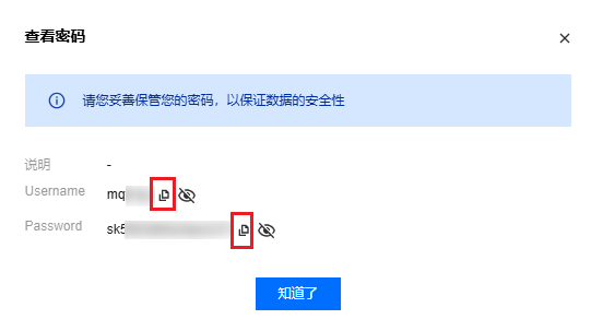 单击操作列的查看密码,在查看密码弹框中单击复制图标。