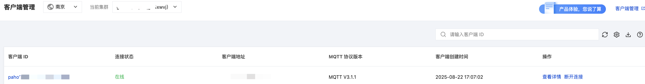 客户端基本信息,包含客户端的 ID、地址、连接状态、创建时间和 MQTT 协议版本。