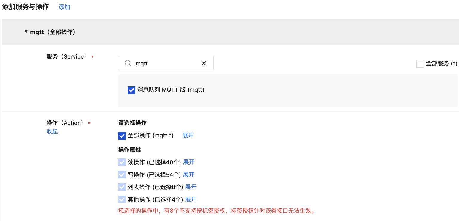您可通过访问管理控制台的策略功能,将主账号拥有的、已经绑定标签的 MQTT 资源,通过按标签授权的方式授予子账号这些资源的读写权限,得到权限的子账号可以获得具有相应标签下资源的控制能力。