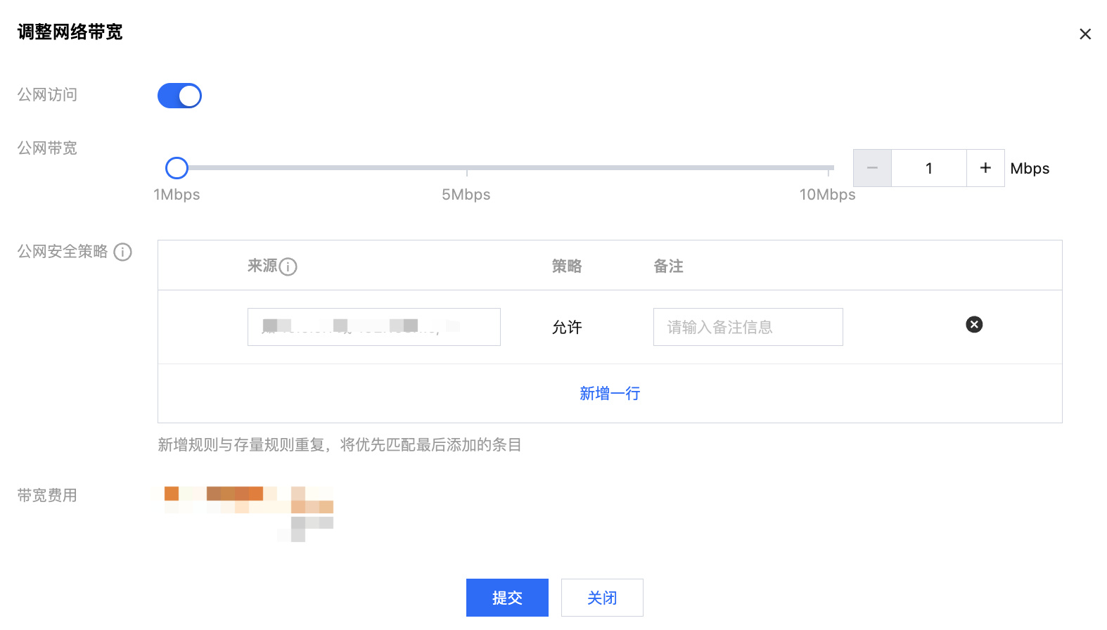 公网安全策略支持填入 IP 和 IP网段,不设置安全策略默认禁止所有 IP 访问。若新增规则与存量规则重复,将优先匹配最后添加的条目。