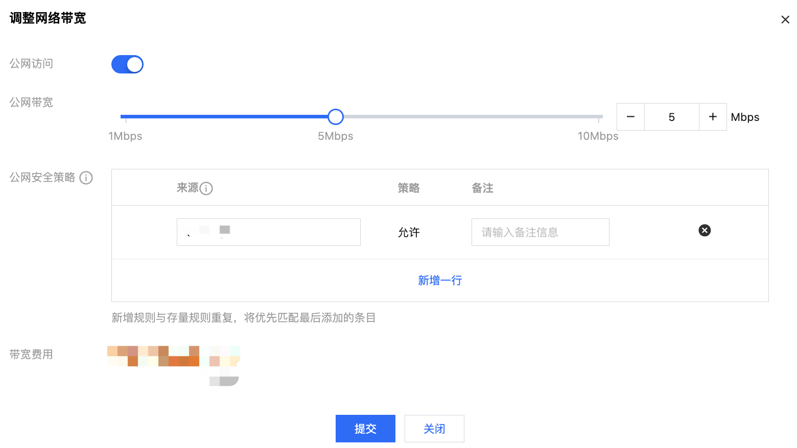 5. 在弹窗中,开启公网带宽后,选择所需要的公网带宽大小,并配置好公网安全策略。