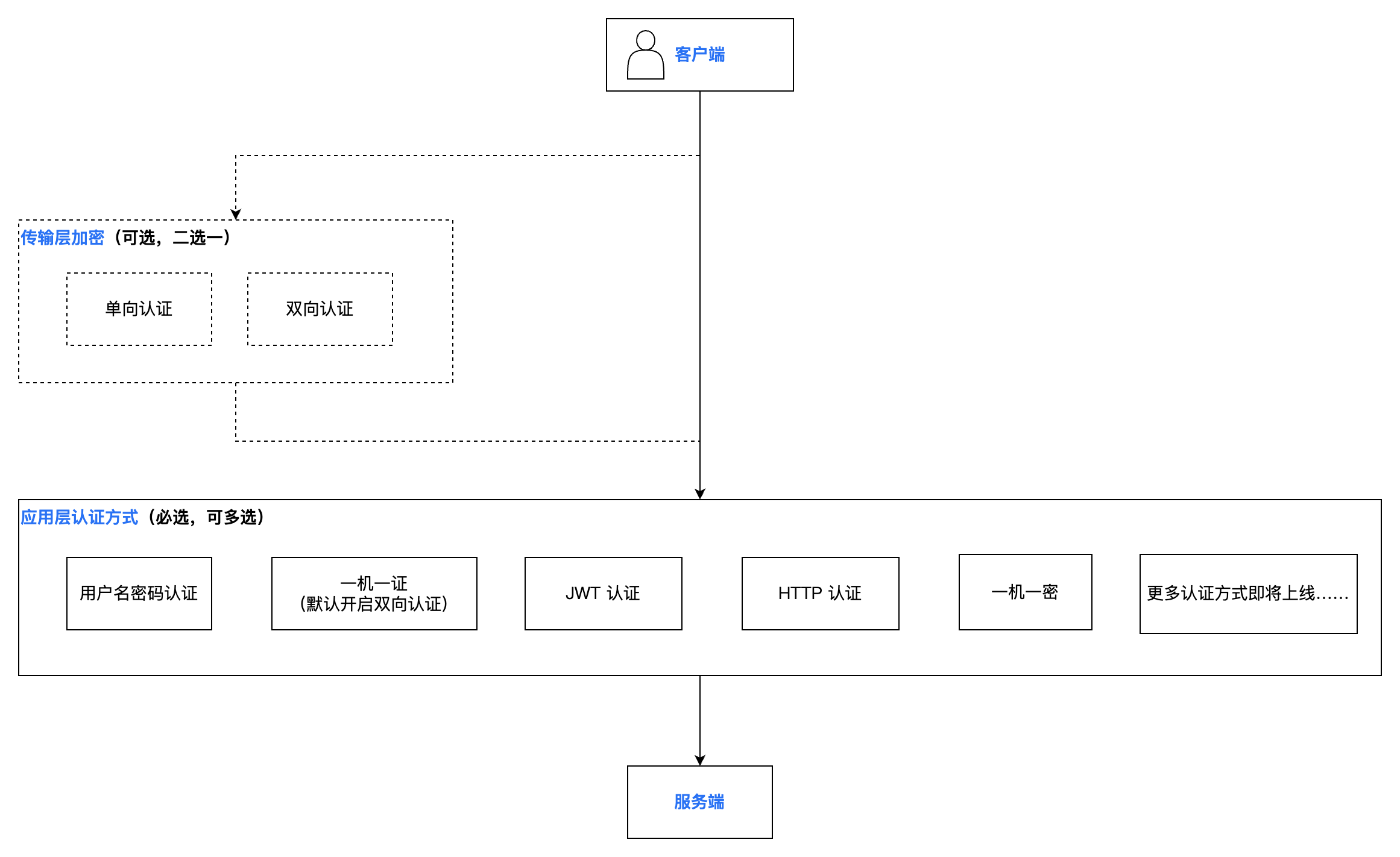 双向认证:客户端与服务端之间相互认证,客户端对服务端的认证通过服务端证书完成,服务端对客户端的认证通过 CA 证书完成。验证通过则允许客户端连接服务端。