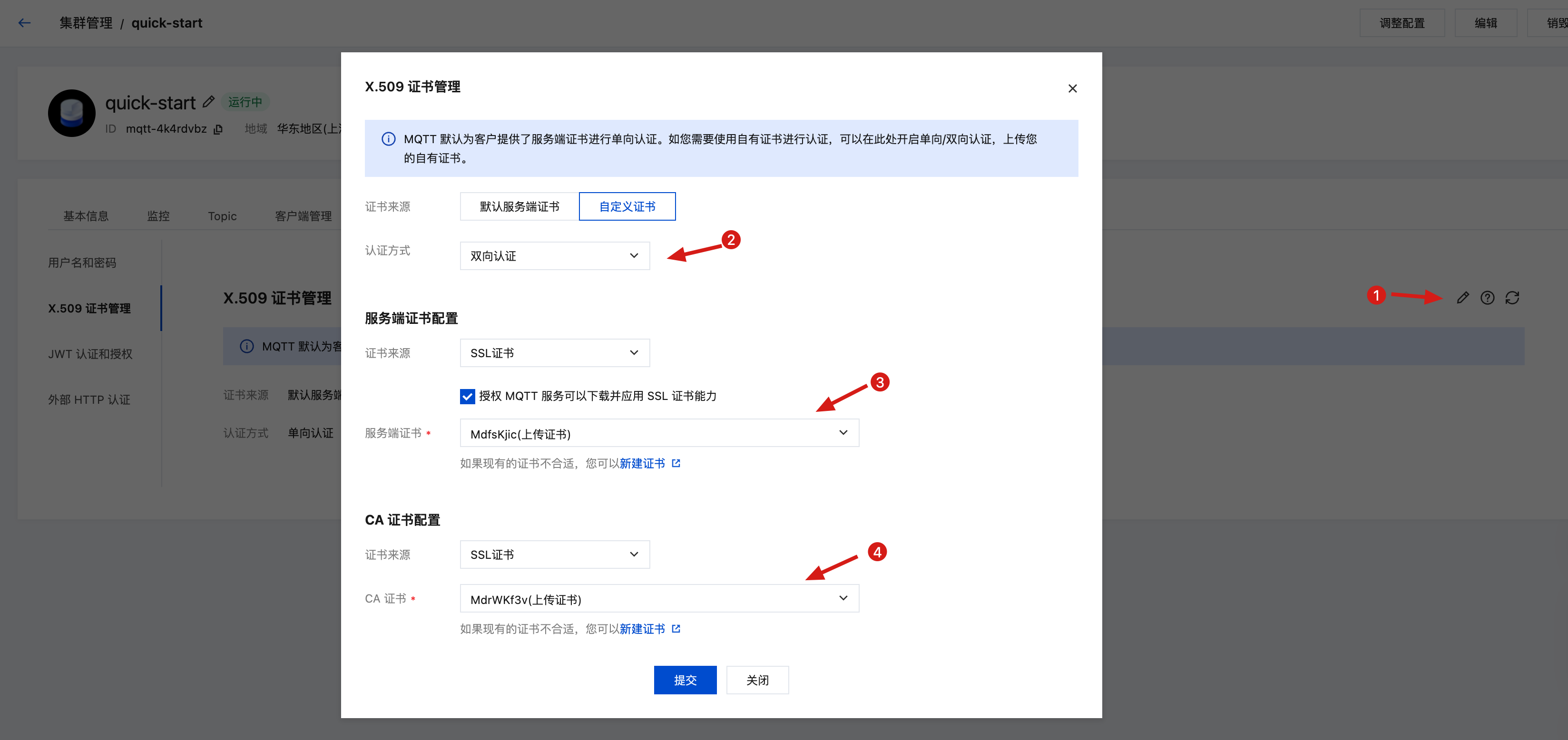 2. 配置服务端证书对、信任证书到 MQTT 实例;