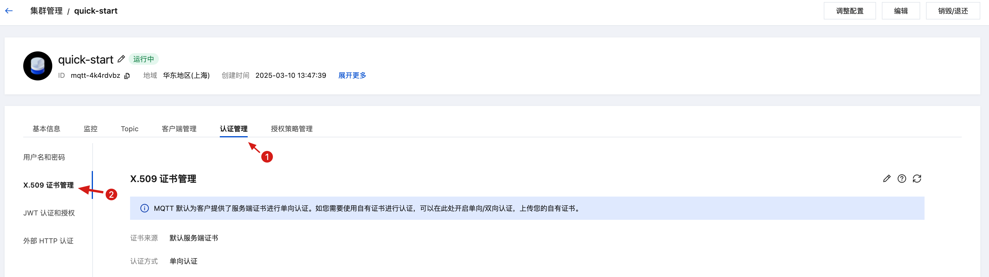 MQTT 控制台 > 集群管理/实例页面,切到认证管理/X.509证书管理页面: