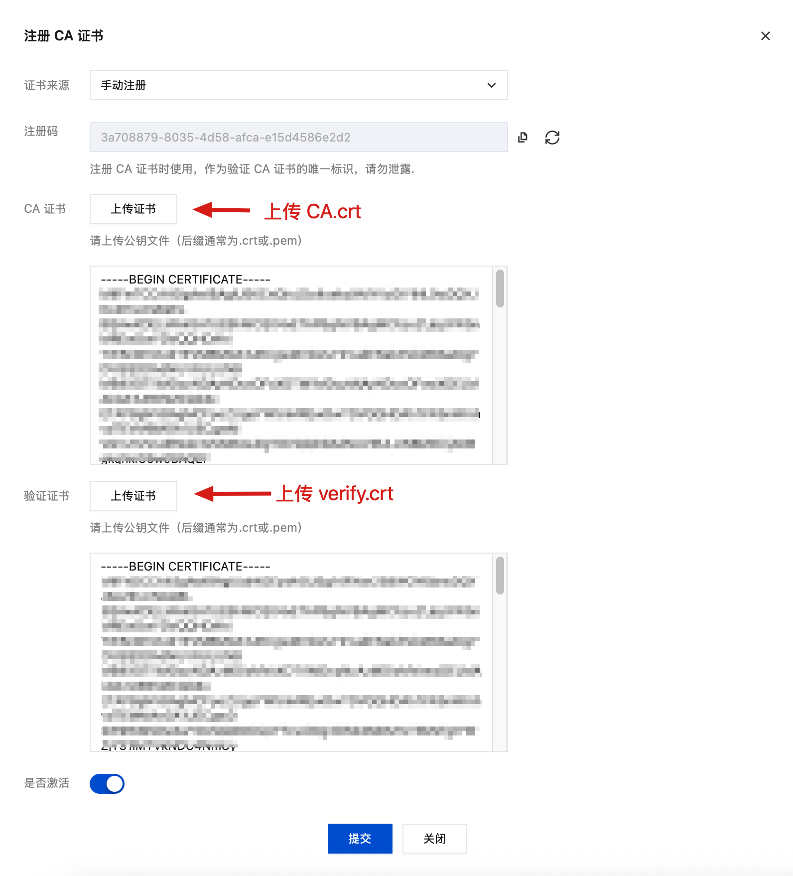 openssl genrsa -out verify.key 4096openssl req -new -key verify.key -out verify.csr -subj "/C=CN/ST=ZheJiang/L=HangZhou/O=IoV/CN=3a708879-8035-4d58-afca-e15d4586e2d2"openssl x509 -req -in verify.csr -CA CA.crt -CAkey CA.key -CAcreateserial -out verify.crt -days 3 -sha256