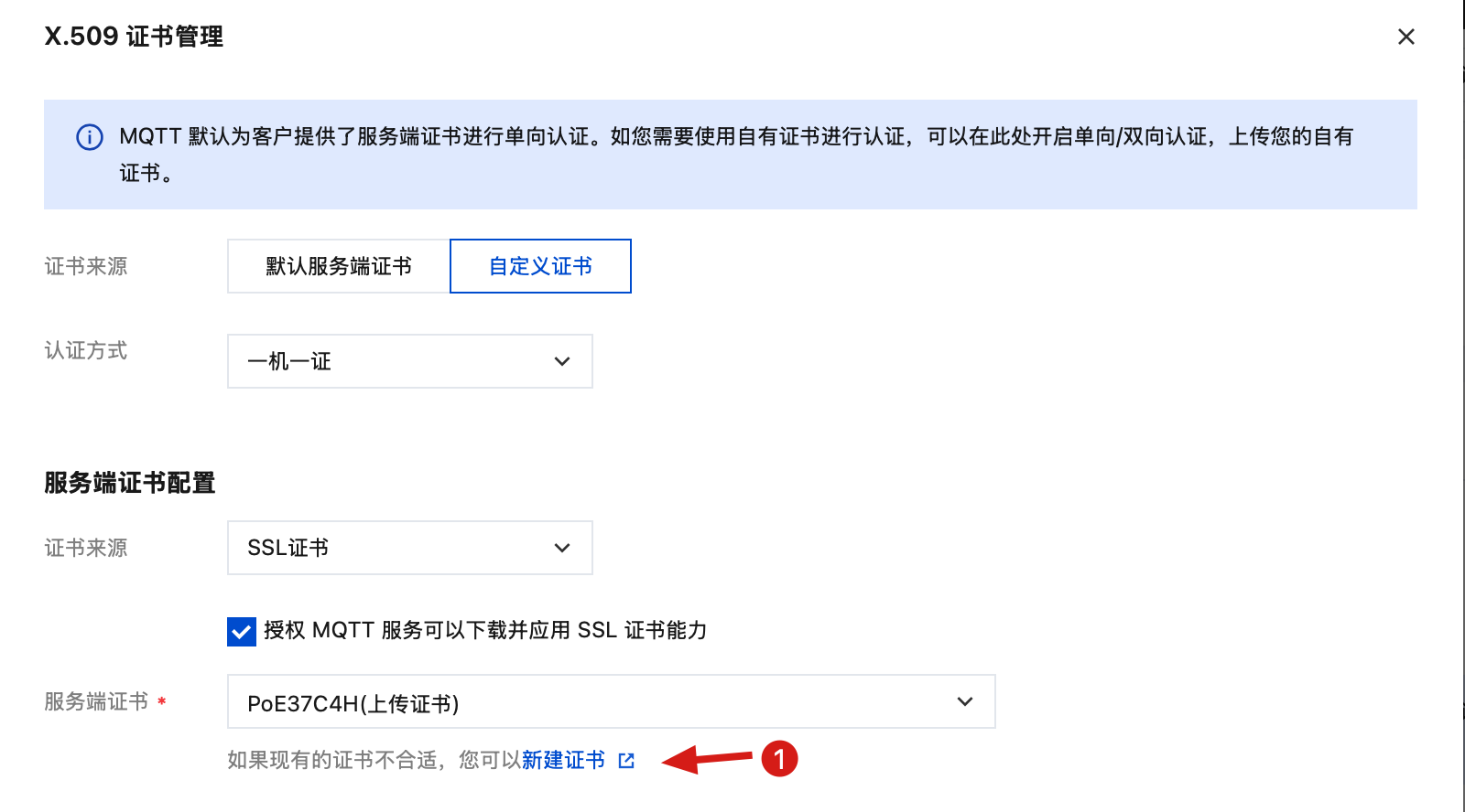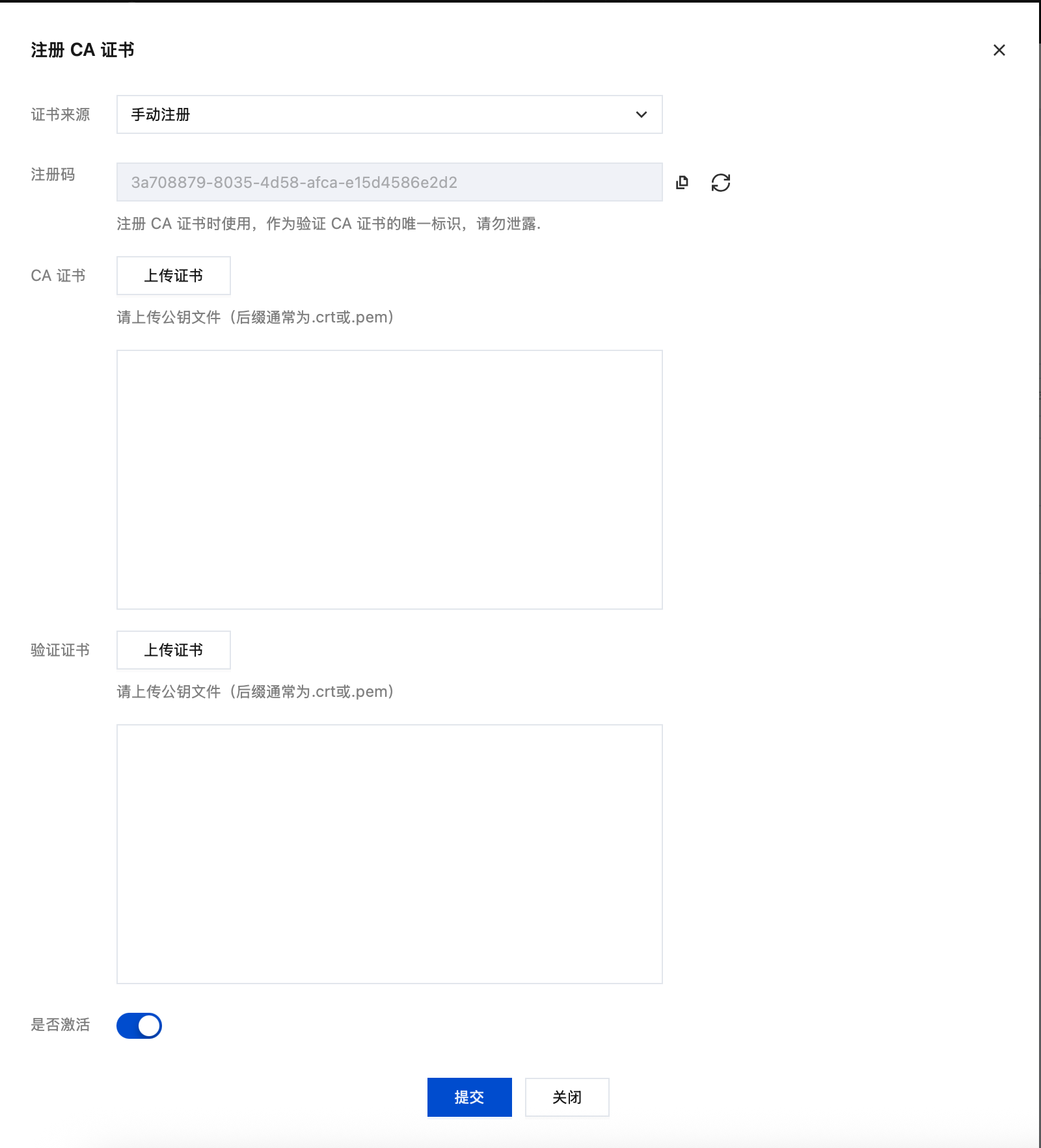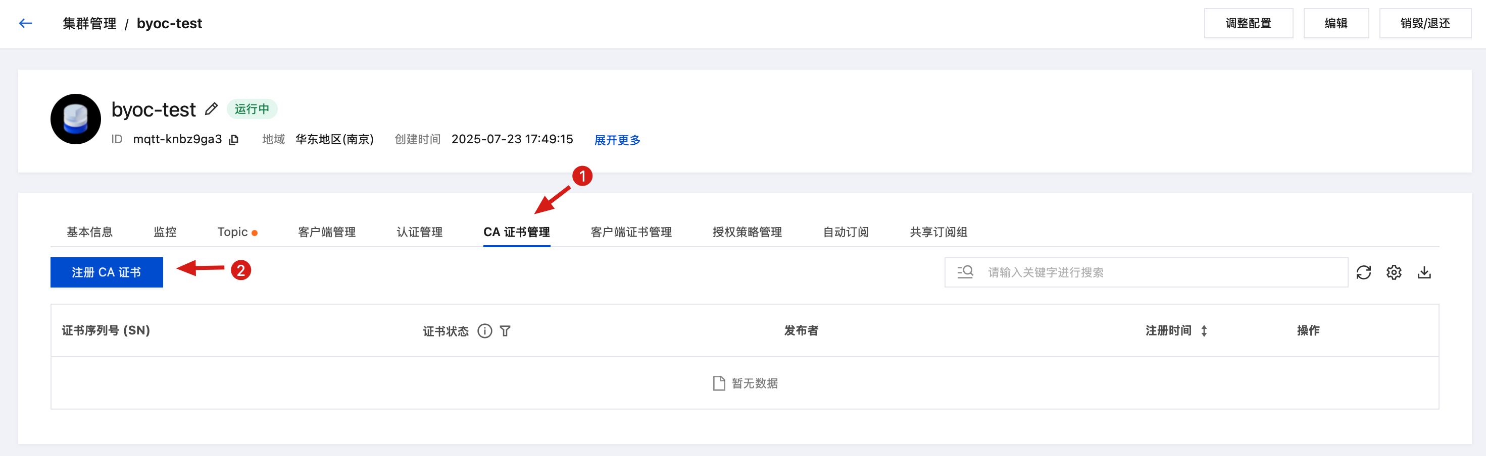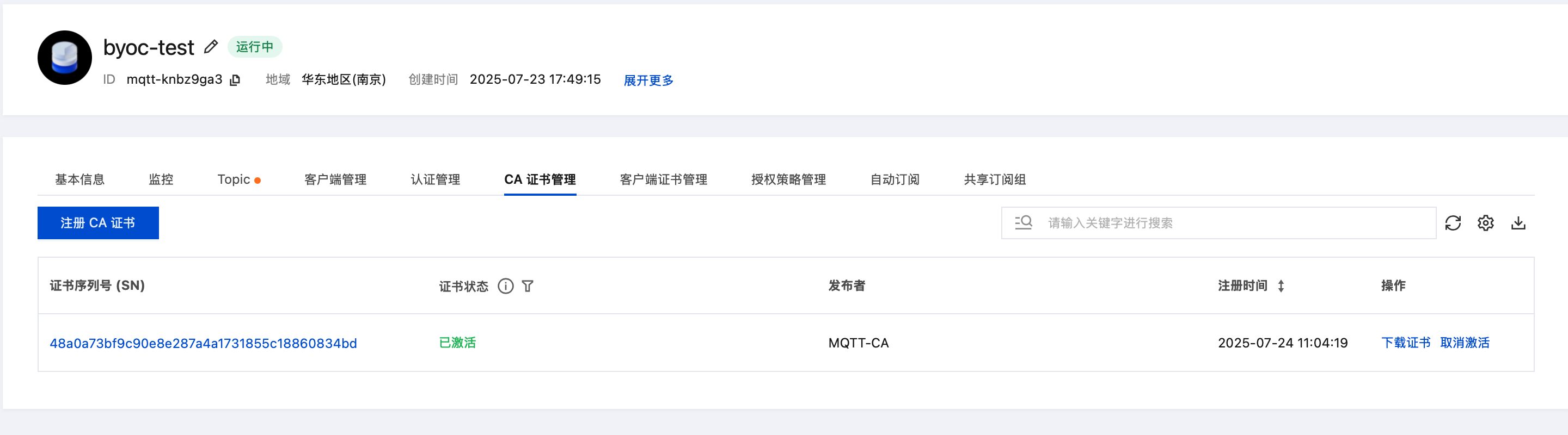 openssl genrsa -out CA.key 4096openssl req -new -x509 -key CA.key -sha256 -subj "/C=CN/ST=ZheJiang/L=HangZhou/O=TencentCloud/CN=MQTT-CA" -days 3650 -out CA.crt