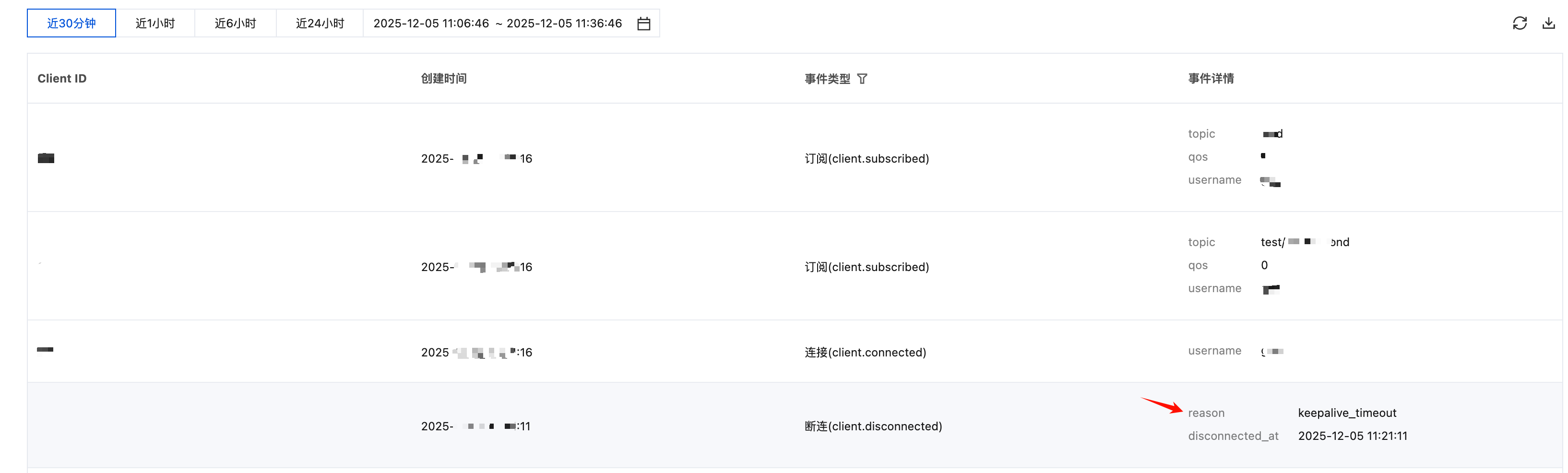 keepalive_timeout | MQTT Broker 节点未在1.5倍 keep-alive 周期内收到客户端交互报文。 | 网络或客户端问题。 1. 检查设备网络连接是否稳定。 2. 检查设备CPU/内存负载是否过高,导致无法及时发送心跳包。 3. 如果是弱网环境,可适当调大 keep-alive 值 |