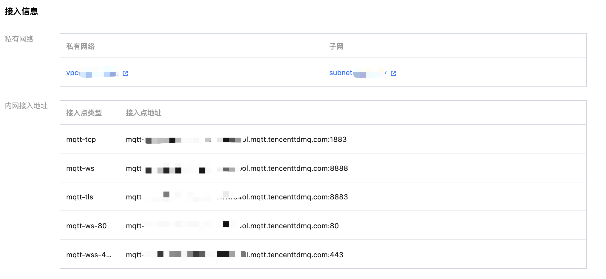 host | MQTT 实例接入点主机地址,在控制台目标集群基本信息 > 接入信息模块复制。位置如下图所示。 标准接入点: mqtt-xxx.mqtt.tencenttdmq.com (端口 1883)TLS 接入点: mqtt-xxx.mqtt.tencenttdmq.com (端口 8883)标准 WebSocket 接入点: mqtt-xxx.mqtt.tencenttdmq.com (端口 80, 路径 /mqtt)TLS WebSocket 接入点: mqtt-xxx.mqtt.tencenttdmq.com (端口 443, 路径 /mqtt) ![]() |