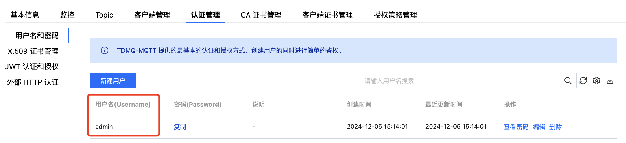 username | 连接用户名,在控制台集群详情页认证管理页面复制。 ![]() |