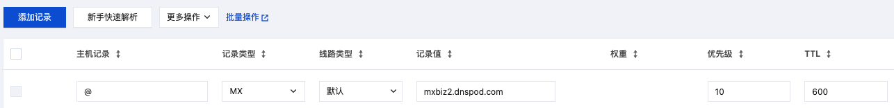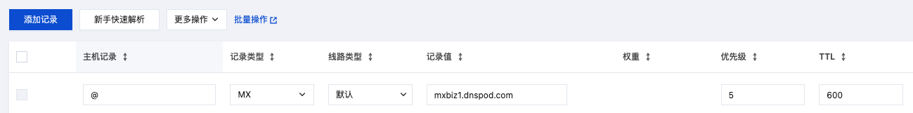 例如,设置一个 MX 记录的记录值为 mail.dnspod.com,需要添加一个主机记录为 “mail” 的 A 记录。