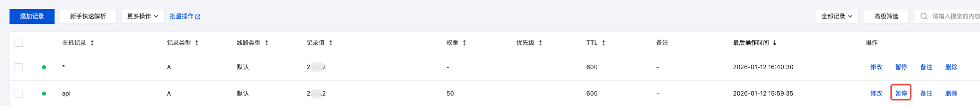 暂停解析记录:如果您在使用解析过程中,暂时不需要某条解析记录,您可以将该解析记录暂停,暂停后在请求过程中无法查询此解析记录,解析生效时间为您设置的 TTL 时间。