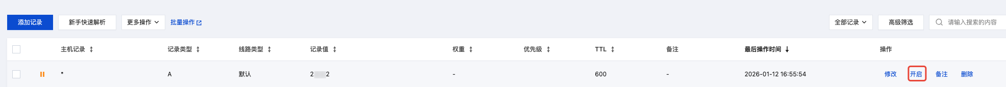 4. 当您需要启用已暂停的解析记录时,请单击操作栏的开启 。如下图所示: