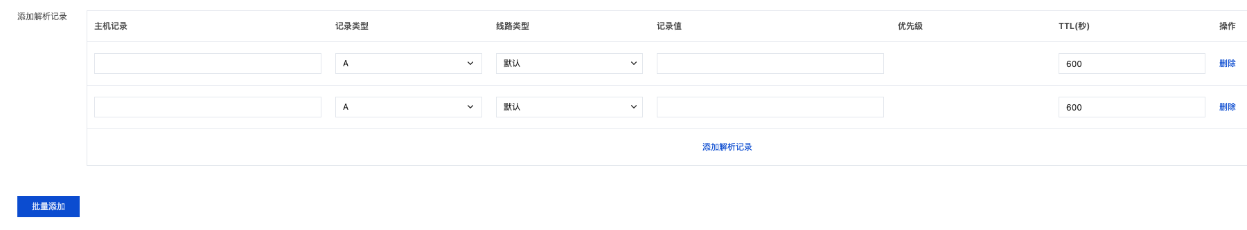 如果您有多个域名需要批量添加记录,您可以选择使用 DNSPod 为您提供的域名记录批量添加功能。域名记录批量添加功能可同时对多个域名进行添加记录操作。