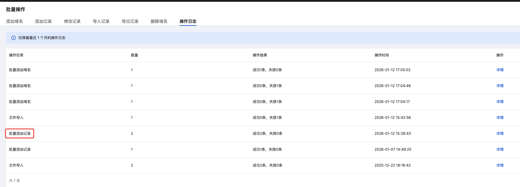 在批量管理页面,选择操作日志页签,即可查看您的操作结果。如下图所示: