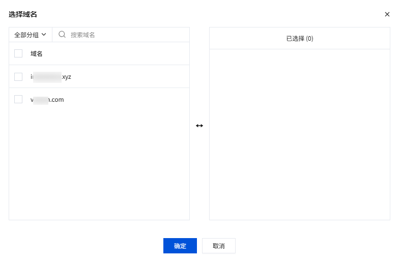 3. 在选择域名页面,勾选需要批量添加解析记录的域名后,单击确定。