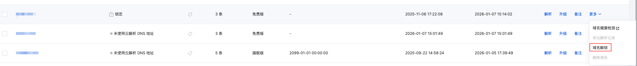 2. 在权威解析页面,选择目标域名,单击操作栏中的更多 > 域名解锁。如下图所示: