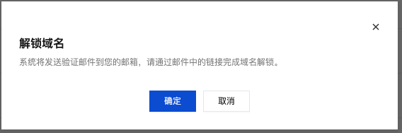 3. 在弹出的解锁域名窗口中,单击确定,主账号的邮箱将收到域名解锁确认的邮件。如下图所示: