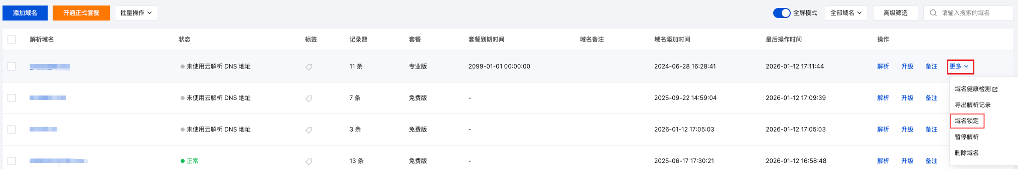 2. 在权威解析页面,选择目标域名,单击操作栏中的更多 > 域名锁定。如下图所示: