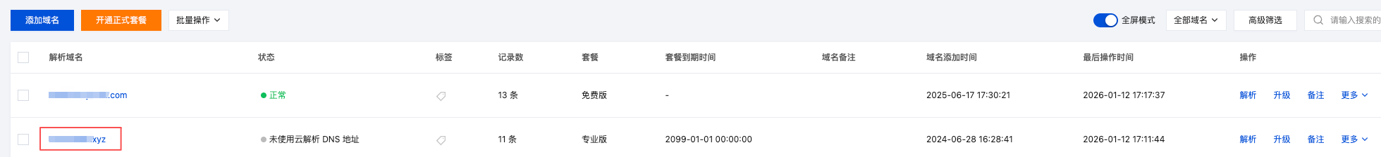 2. 在权威解析页面,选择目标域名,单击域名名称,进入该域名的管理页面。