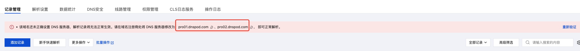 3. 在记录管理页面中,若存在如下提示,说明 DNS 服务器不正确。您可复制提示中正确的 DNS 地址。如下图所示: