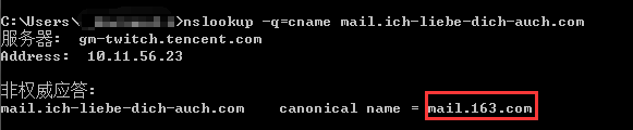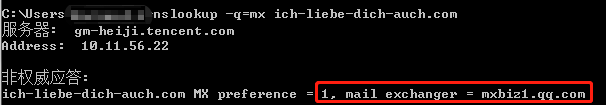 3. 查询域名的 MX 解析记录(需配置,MX 解析记录是用于指定邮箱服务器的地址):nslookup -q = mx 域名。