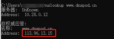 2. 回车后结果显示的 IP 若和您设置的解析记录中的 IP 保持一致,则表明解析已经生效。如下图所示: