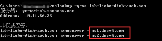 4. 查询域名的 NS 解析记录(需配置,NS 解析记录是用于指定邮箱服务器的地址):nslookup -q = ns 域名。