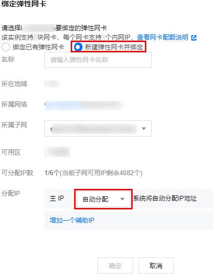 4. 在弹出的“绑定弹性网卡”窗口中,选择新建弹性网卡并绑定,填写相关信息,单击确定。