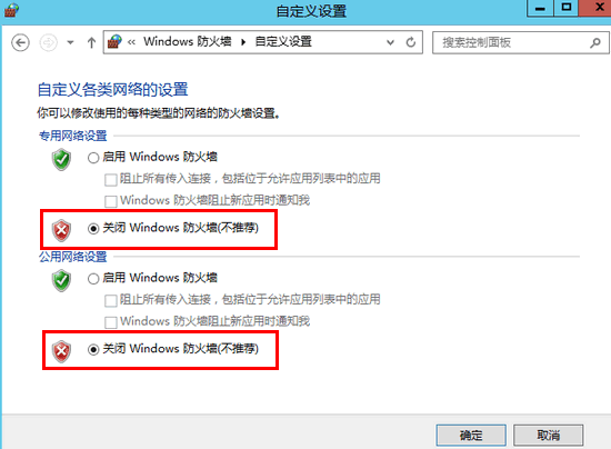 4. 在“专用网络设置”和“公用网络设置”模块中分别选择关闭 Windows 防火墙,单击确定即可。
