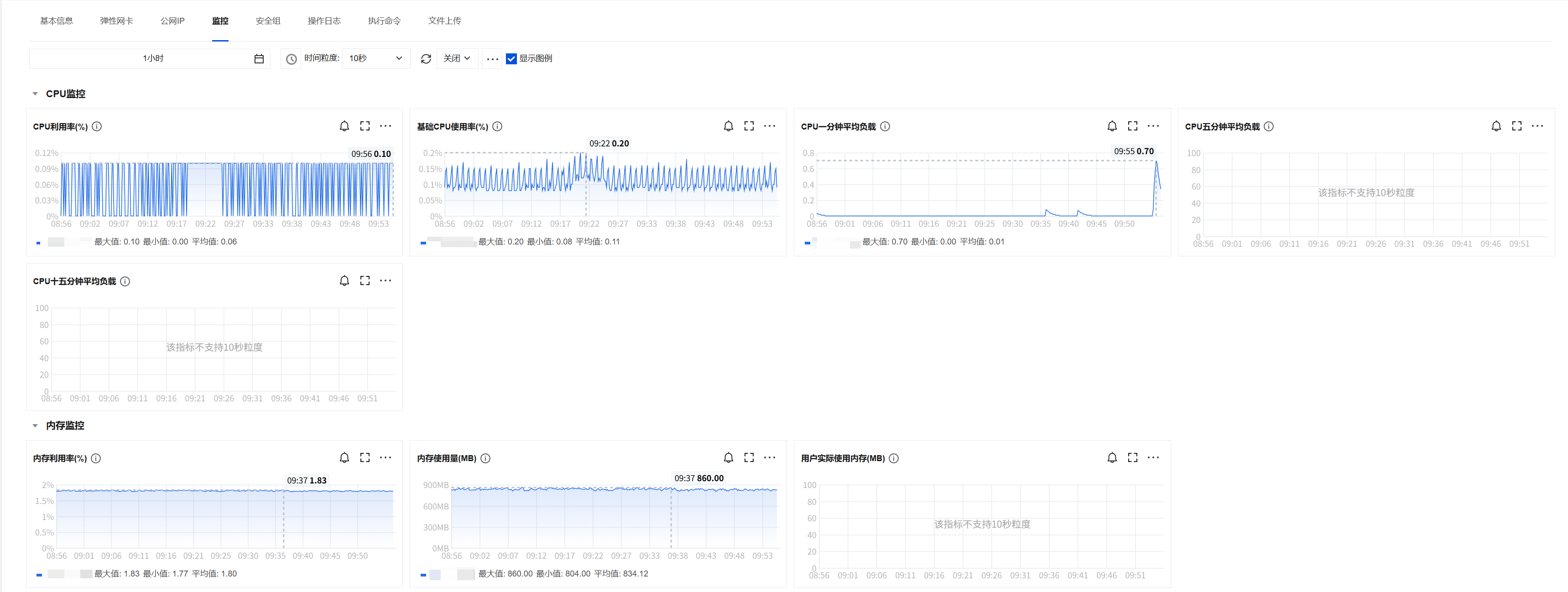 3. 在实例的详情页面,选择监控页签,查看实例资源的使用情况。如下图所示:
