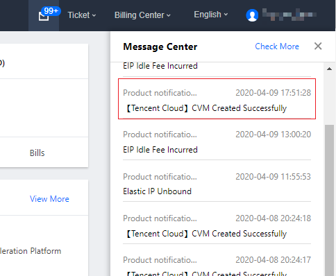 系统自动生成的登录密码会以电子邮件和控制台 站内信 发送给您。以下操作内容以站内信为例: 2. 单击右上角的 ,选择对应的产品消息。如下图所示: