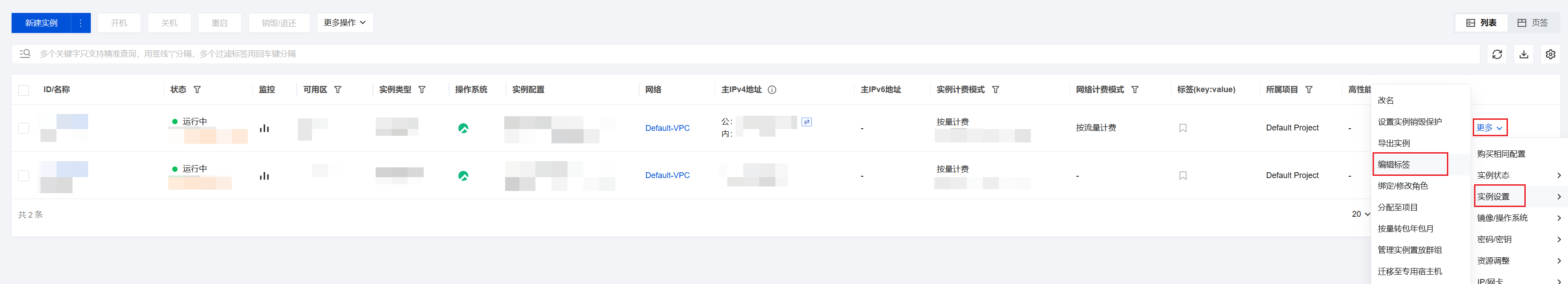 选择需要编辑标签的实例,选择更多 > 实例设置 > 编辑标签。如下图所示: