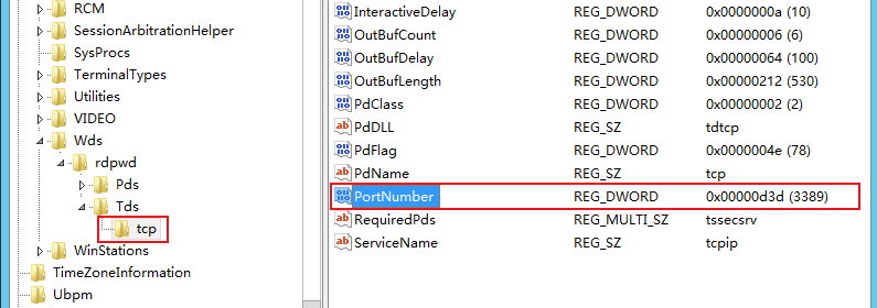 6. 双击 RDP-Tcp 中的 PortNumber。