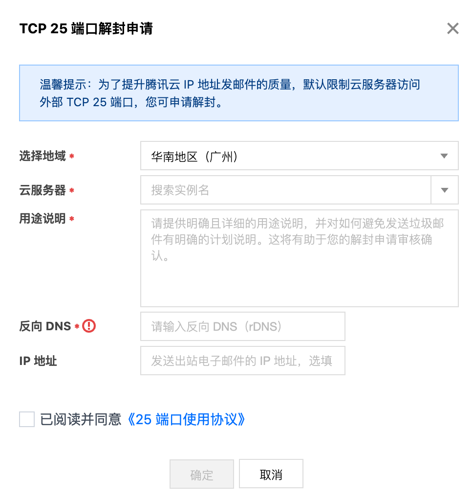 为了提升腾讯云 IP 地址发邮件的质量,基于安全考虑,默认封禁云服务器访问外部 TCP 25 端口。如果您的业务场景需要基于云服务器使用 TCP 25 端口(例如搭建邮件服务),可参见本文档申请解封该端口。