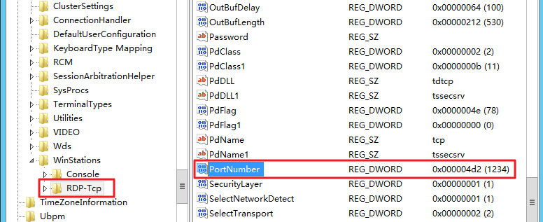 ,并将 PortNumber 数据(即3389端口号)修改为0 - 65535之间未被占用端口。如下图所示: 4. 在左侧的注册表导航中,依次展开HKEY_LOCAL_MACHINE > SYSTEM > CurrentControlSet > Control > Terminal Server > WinStations > RDP-Tcp目录。