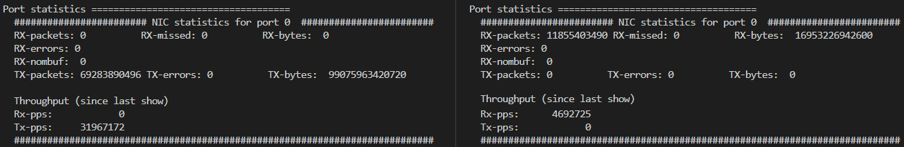 nb-cores 修改为2。关于命令参数的更多信息,请参见 testpmd-command-line-options。/root/dpdk/build/app/testpmd -l 8-191 -w 0000:00:05.0 -- --burst=128 --nb-cores=32 --txd=512 --rxd=512 --txq=16 --rxq=16 --forward-mode=txonly --txpkts=1430 --stats-period=1