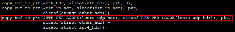 copy_buf_to_pkt(&pkt_udp_hdr, sizeof(pkt_udp_hdr), pkt,,将其替换为如下内容:copy_buf_to_pkt(&RTE_PER_LCORE(lcore_udp_hdr), sizeof(RTE_PER_LCORE(lcore_udp_hdr)), pkt,