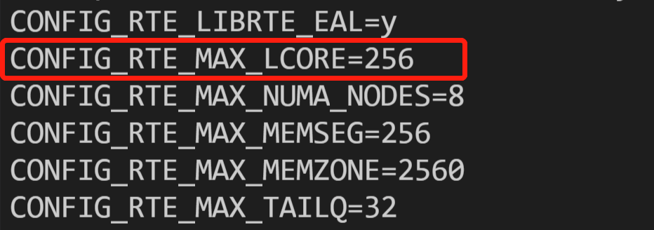 CONFIG_RTE_MAX_LCORE=128,如果您的系统中 cpu core 数大于128就可以改成256。修改完成后如下图所示: