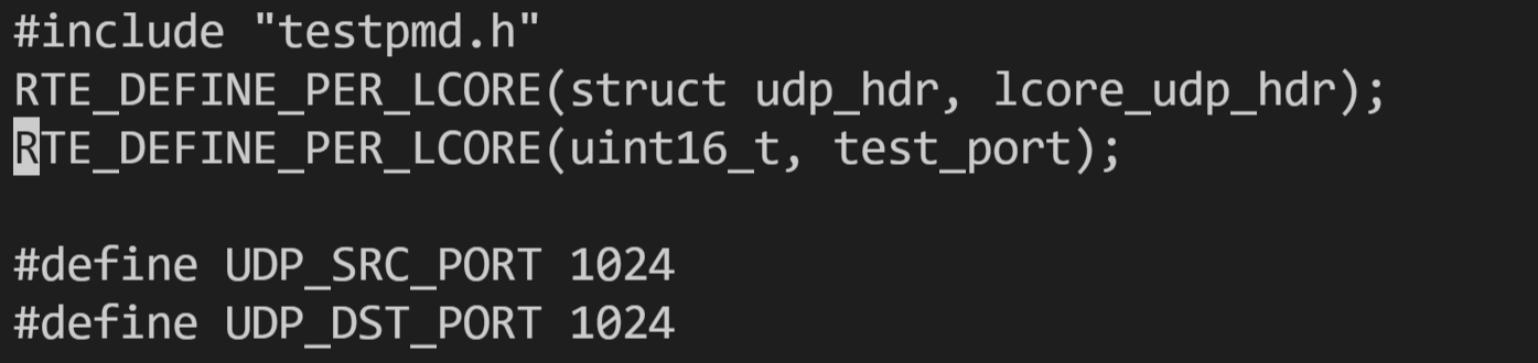 #include "testpmd.h",另起一行输入如下内容:RTE_DEFINE_PER_LCORE(struct udp_hdr, lcore_udp_hdr);RTE_DEFINE_PER_LCORE(uint16_t, test_port);
