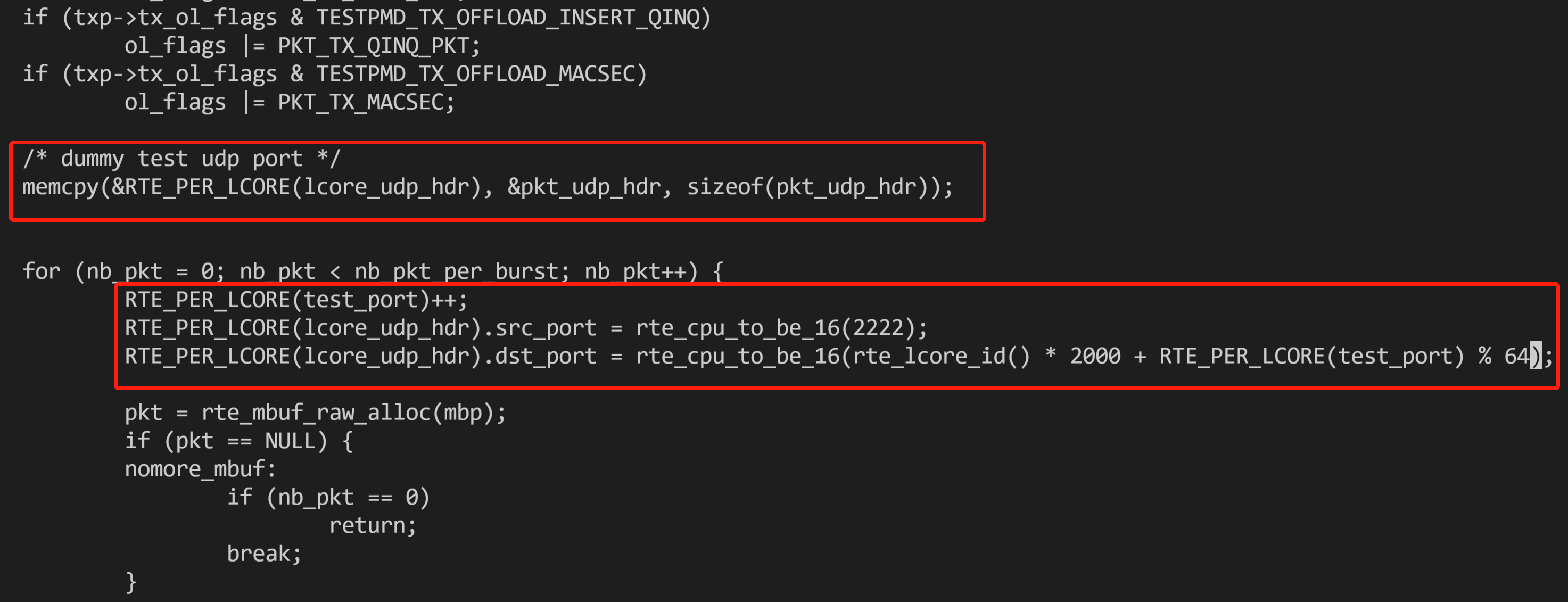 ol_flags |= PKT_TX_MACSEC;,另起一行输入如下内容:/* dummy test udp port */memcpy(&RTE_PER_LCORE(lcore_udp_hdr), &pkt_udp_hdr, sizeof(pkt_udp_hdr));