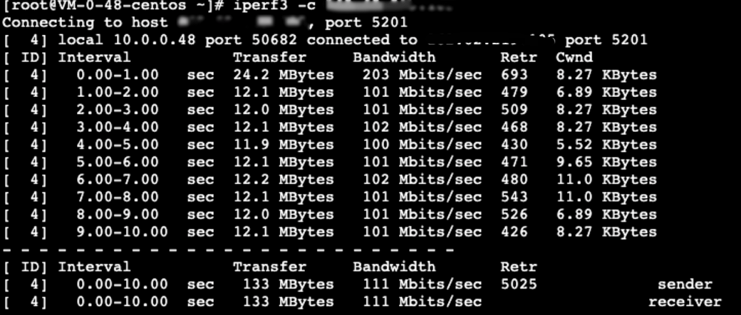 返回测试结果如下图所示,可知源端服务器与测试 CentOS 7.5 实例之间传输速度大概为111Mbps。