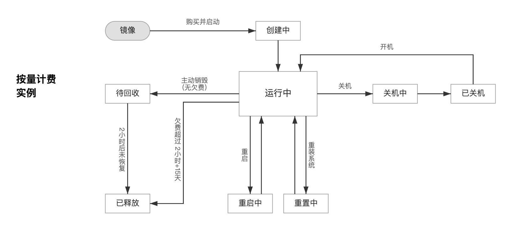 待回收 | 稳定状态 | 实例进入回收站起15天内,或主动销毁按量计费实例选择2小时后释放后的2小时内,处于回收站内的状态。此状态不对外提供服务。 |