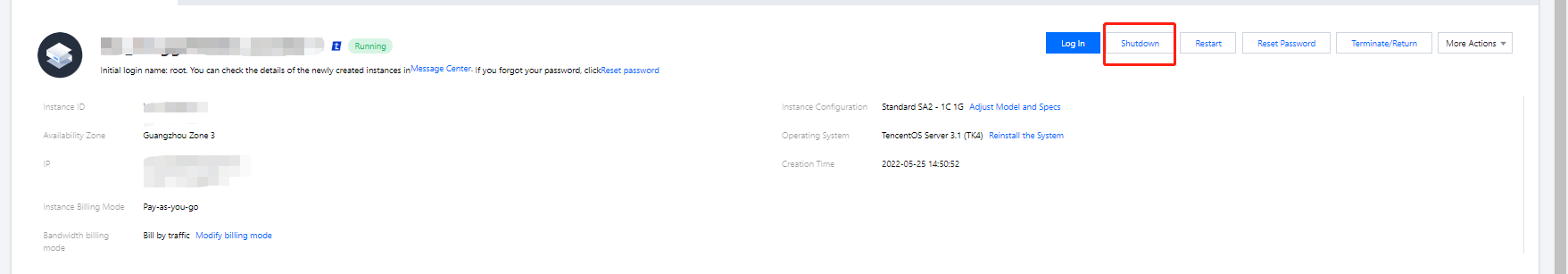 页签视图:选择实例详情页面中的关机。如下图所示: