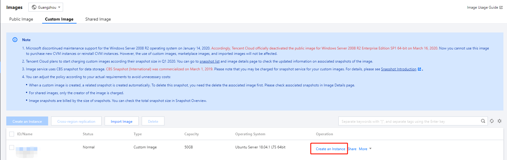 待镜像完成创建后,在镜像列表中选择您创建的镜像,单击其所在行右侧的创建实例,即可购买与之前相同镜像的服务器。如下图所示: